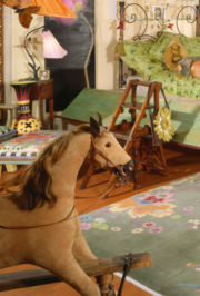 I felt that if the Dohenys had a daughter, the room would certainly have befitted a princess. Many of these antiques, such as the Mary Pickford desk, might have been handed down and Allegra would be the lucky beneficiary. Further inspiration for Allegra’s room evolved from my desire to create a showcase for my 25-year global collection of little girl couture.