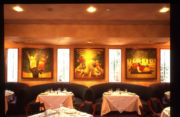 Also gracing Spago Beverly Hills were three Lowell Hererro original canvases, specifically commissioned by Barbara Lazaroff her the new Puck/Lazaroff restaurant. These three paintings celebrating the rich and robust traditions of the Italian countryside — Botero-sized figures working in the olive trees, the vineyards, and in repose among the apple orchard — were one of the focal points of the main dining room as you can see above. (Treat yourself to a larger image of these paintings.)