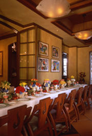The main dining room and the patio can be two distinct spaces and each has its own look, feeling, and appeal. But they can also come together to accommodate large groups such as in this setup for the Annual Passover Sedar (which benefits Mazon). Maxine Picard captured this well.