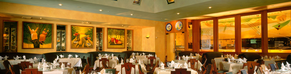 Also gracing Spago Beverly Hills were three Lowell Hererro original canvases, specifically commissioned by Barbara Lazaroff her the new Puck/Lazaroff restaurant. These three paintings celebrating the rich and robust traditions of the Italian countryside — Botero-sized figures working in the olive trees, the vineyards, and in repose among the apple orchard — were one of the focal points of the main dining room as you can see above. (Treat yourself to a larger image of these paintings.)