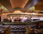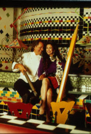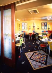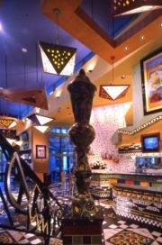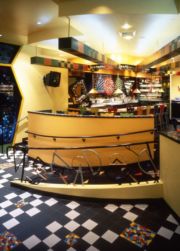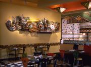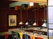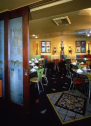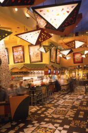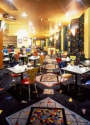 As co-founder of the Wolfgang Puck Food Company, Lazaroff developed the design of the former Wolfgang Puck Cafés, which were featured on college campuses and other venues in the United States, Canada and Japan. The signature Café design had showcased the company’s logo with Lazaroff’s custom “pizza chairs,” triangular-shaped fused glass sconces and elaborate, vividly colorful geometric mosaic on floor and wall surfaces. ~WolfgangPuck.com