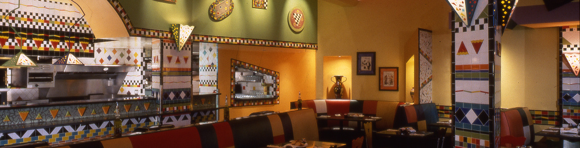 As co-founder of the Wolfgang Puck Food Company, Lazaroff developed the design of the former Wolfgang Puck Cafés, which were featured on college campuses and other venues in the United States, Canada and Japan. The signature Café design had showcased the company’s logo with Lazaroff’s custom “pizza chairs,” triangular-shaped fused glass sconces and elaborate, vividly colorful geometric mosaic on floor and wall surfaces. ~WolfgangPuck.com